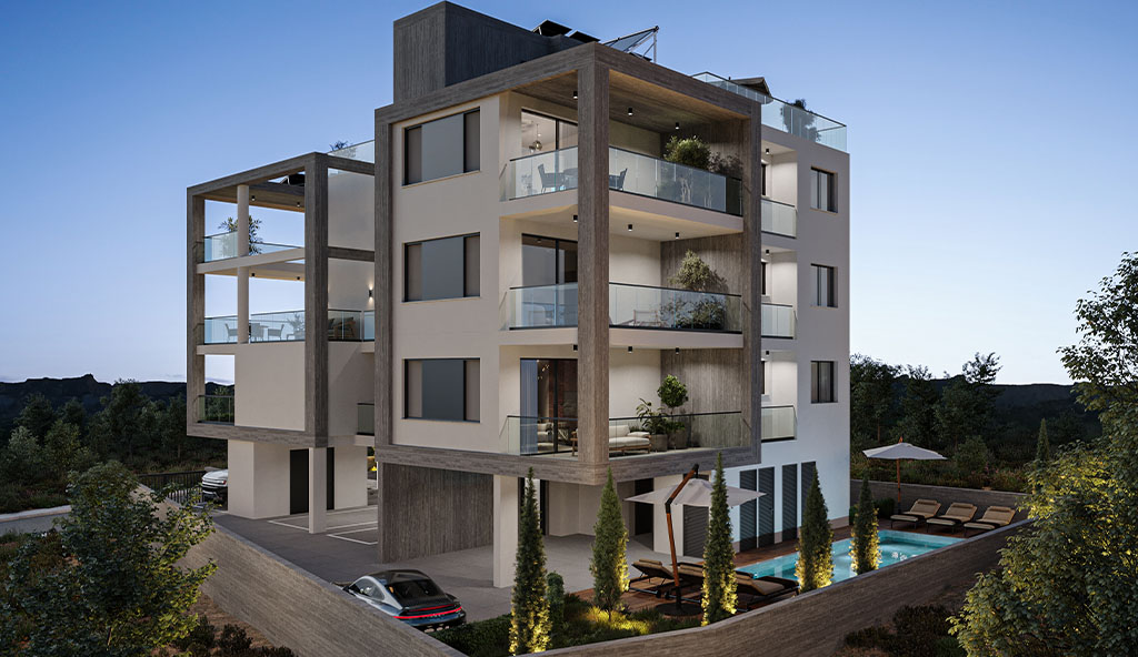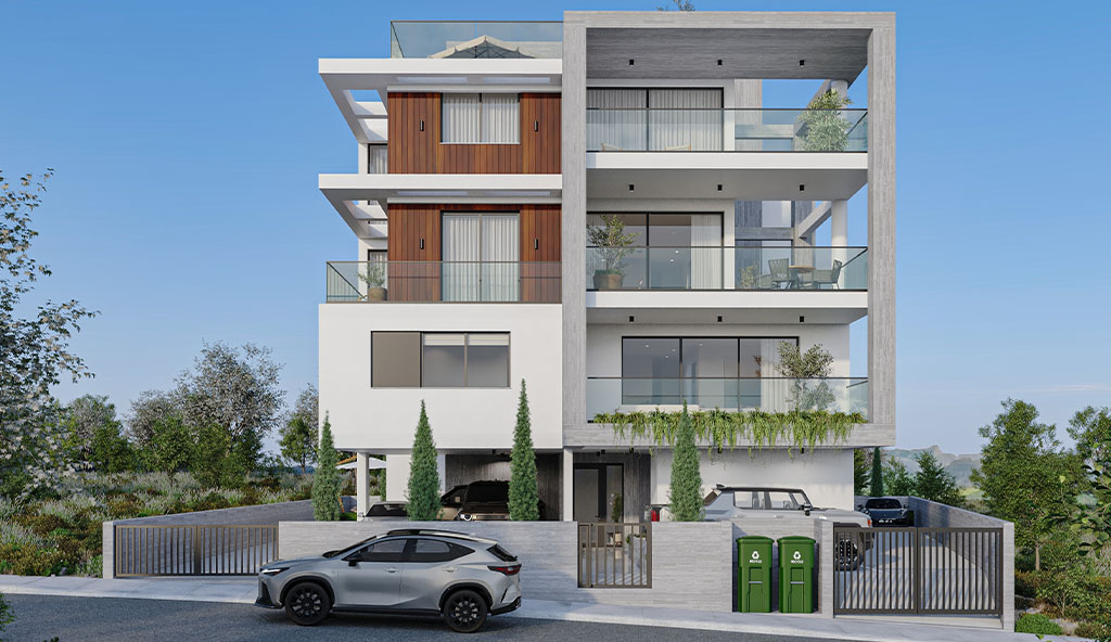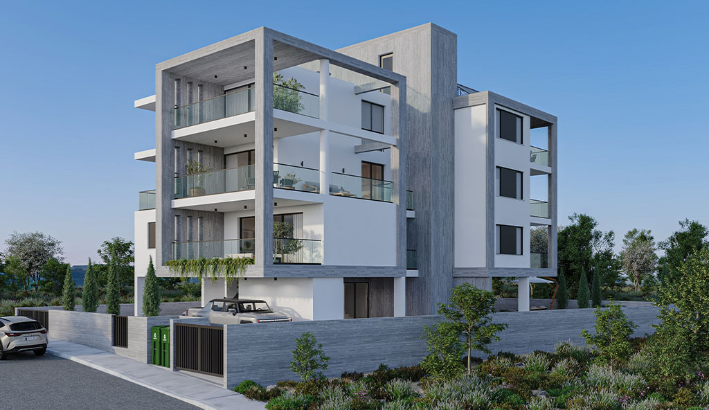 The design of this project had to embrace the structural elements and create the facades of this apartment building. Planked concrete and timber cladding are used to provide a contrast of materials and vertical elements are creating a frame around the verandas of all three floors.