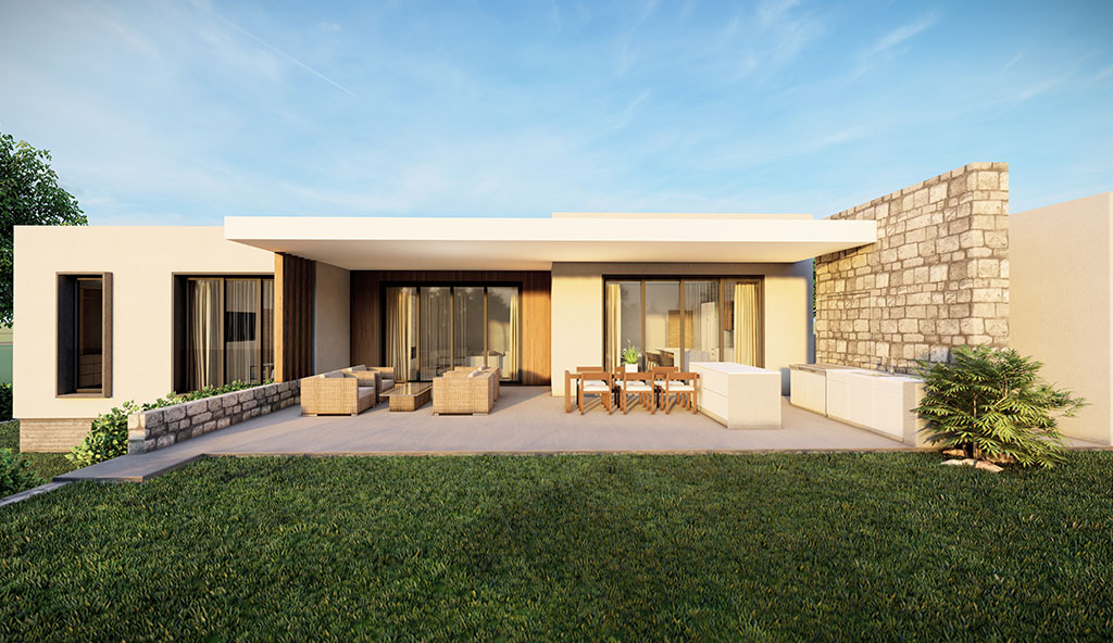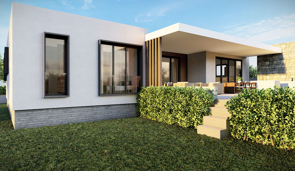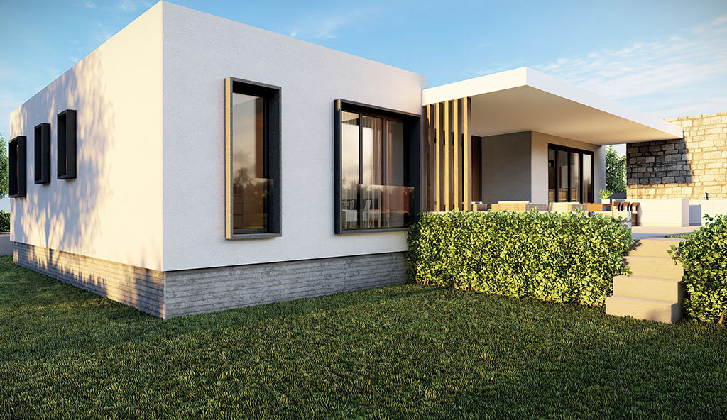 The layout of the house is separated in two zones. These are, the open living and kitchen area with connections to a covered veranda and BBQ space and the bedrooms and office area with smaller openings that the volume shapes the corner of the plot.