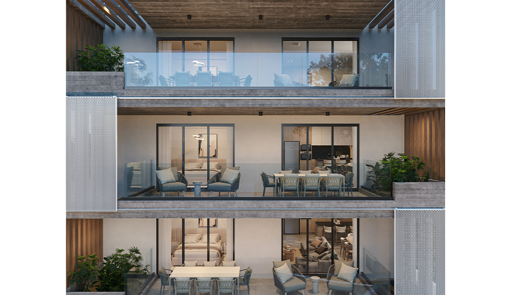 The verandas in the front and rear elevations are forming a separate planked concrete volume with planters that give a more urban and environmentally friendly aesthetic to the building.